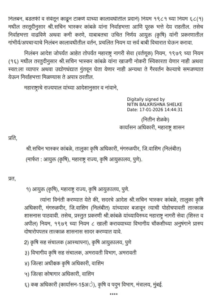 या एकत्रित दबावामुळे आयुक्त (कृषी), महाराष्ट्र राज्य यांनी शासनाकडे निलंबनाची शिफारस केली आणि अखेर १७ जानेवारी रोजी राज्य शासनाला तात्काळ कारवाई करावी लागली.