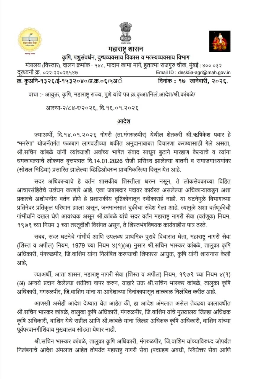 शेतकऱ्यांवर झालेल्या अन्यायाविरोधात उठलेला आवाज अखेर निर्णायक ठरला. मंगरुळपीर तालुक्यात शेतकऱ्यावर शासकीय अधिकाऱ्याने केलेल्या हल्ल्याप्रकरणी ‘शेतकरी न्यूज लाईव्ह’ने सातत्याने लावून धरलेला दणका, तसेच बुलढाणा जिल्ह्याचे शेतकरी नेते आदरणीय रविकांत भाऊ तुपकर यांनी ठामपणे उचललेला प्रश्न, यामुळे अखेर प्रशासनाला झुकावे लागले असून तालुका कृषी अधिकारी सचिन भास्कर कांबळे यांना राज्य शासनाने तात्काळ निलंबित केले आहे.