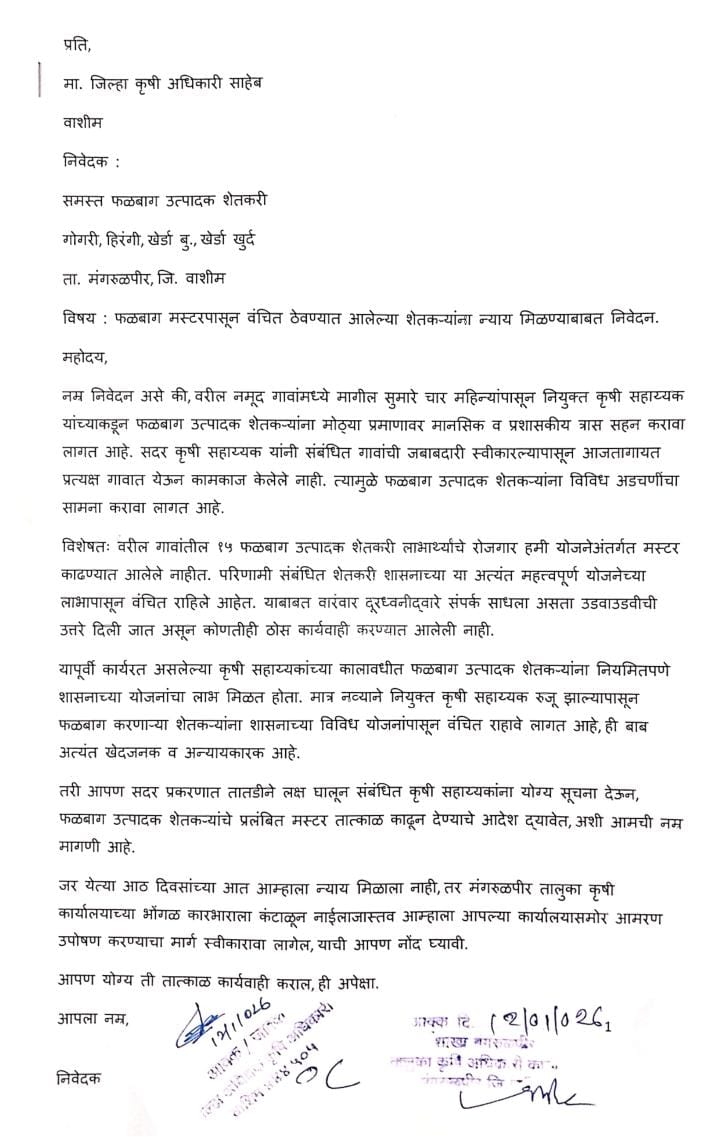 यापूर्वी कार्यरत असलेल्या कृषी सहाय्यकांच्या कालावधीत शेतकऱ्यांना नियमितपणे शासकीय योजनांचा लाभ मिळत होता. मात्र सद्यस्थितीत संबंधित कृषी सहाय्यकांच्या दुर्लक्षामुळे फळबाग करणाऱ्या शेतकऱ्यांना शासनाच्या विविध योजनांपासून वंचित राहावे लागत असल्याचा आरोप निवेदनात करण्यात आला आहे. वारंवार दूरध्वनीद्वारे संपर्क साधूनही उडवाउडवीची उत्तरे दिली जात असून कोणतीही ठोस कार्यवाही होत नसल्याने शेतकऱ्यांमध्ये तीव्र नाराजी आहे. जिल्हा कृषी अधिकाऱ्यांनी या प्रकरणाकडे गांभीर्याने लक्ष देऊन संबंधित कृषी सहाय्यकांना योग्य सूचना देत फळबाग उत्पादक शेतकऱ्यांचे प्रलंबित मस्टर तात्काळ काढण्याचे आदेश द्यावेत, अशी मागणी शेतकऱ्यांनी केली आहे. तसेच आठ दिवसांच्या आत न्याय न मिळाल्यास आपल्या कार्यालयासमोर आमरण उपोषण करण्याचा इशारा ऋषीकेश भिकाजी पवार यांनी निवेदनातून दिला आहे.
